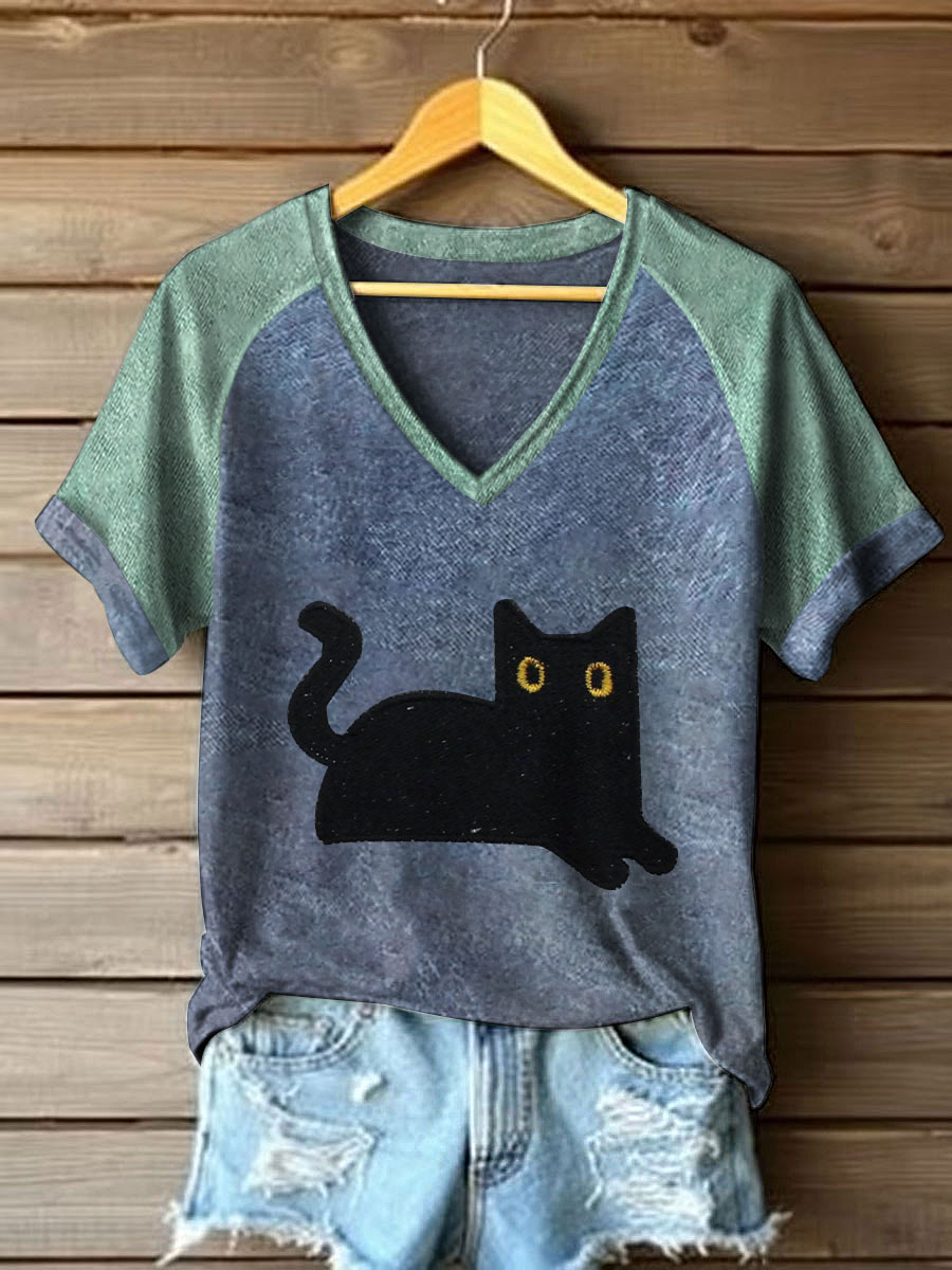 Frauen schwarze Katze Farb block T-Shirts mit V-Ausschnitt