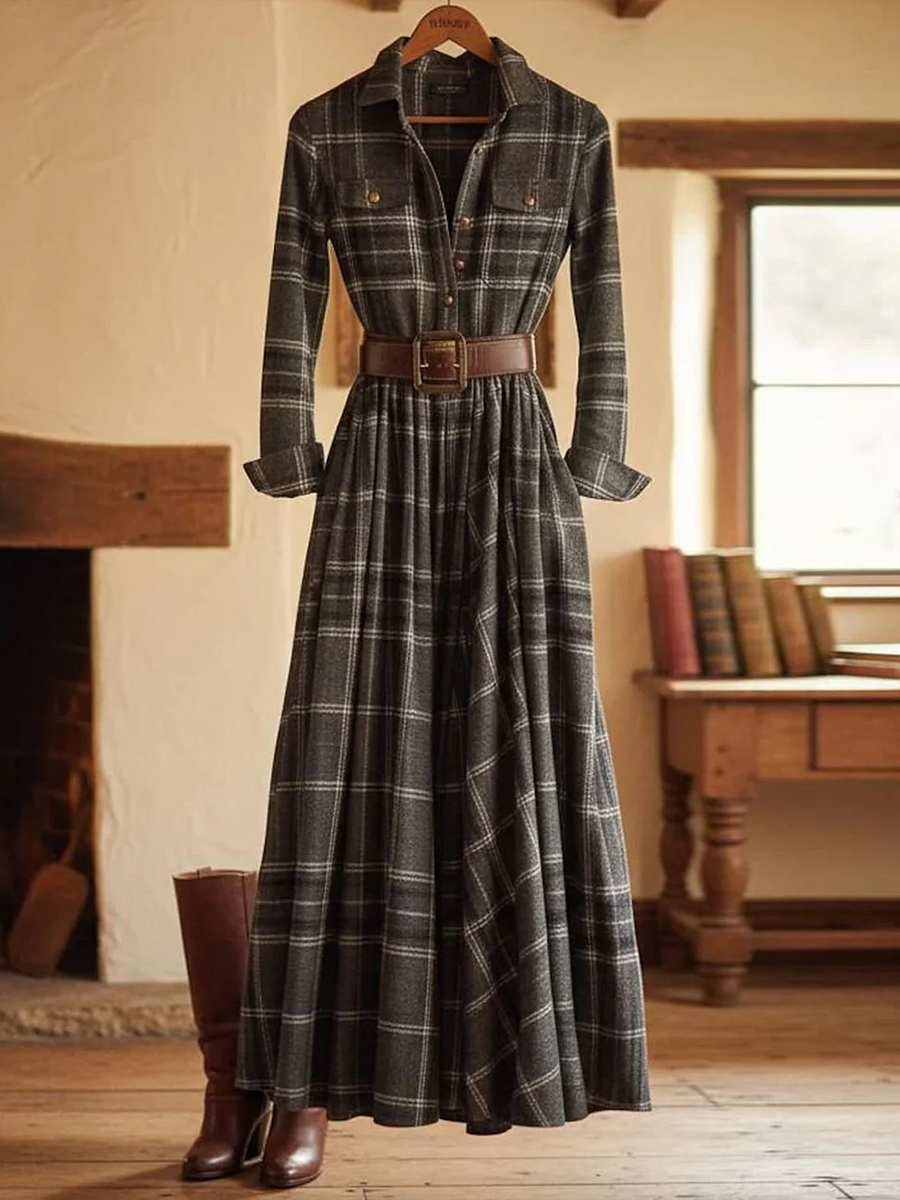 Frauen Vintage Plaid Muster Elegantes Maxi kleid