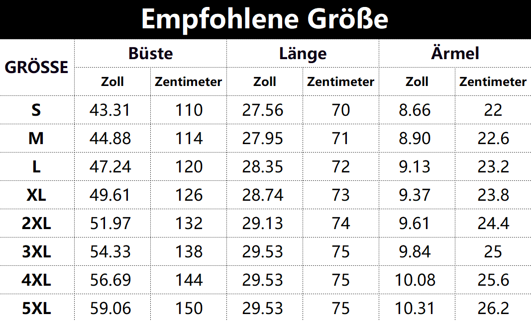 • Vorschlag: *Diese Daten wurden aus der manuellen Messung des Produkts erhalten, es kann um 0,03-0,06 ZOLL/1-3 CM aus geschaltet sein