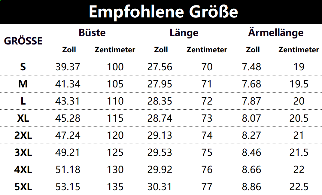 • Vorschlag:* Diese Daten wurden aus der manuellen Messung des Produkts erhalten, es kann um 0,03-0,06 ZOLL/1-3 CM aus geschaltet sein