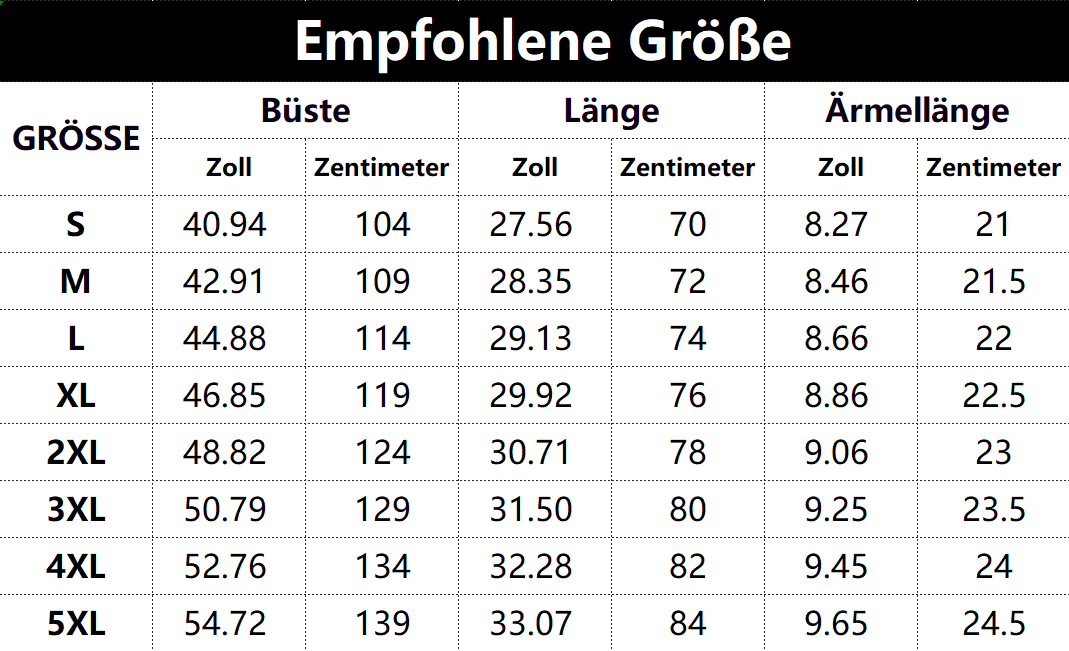 • Vorschlag: *Diese Daten wurden aus der manuellen Messung des Produkts erhalten, es kann um 0,03-0,06 ZOLL/1-3 CM aus geschaltet sein
