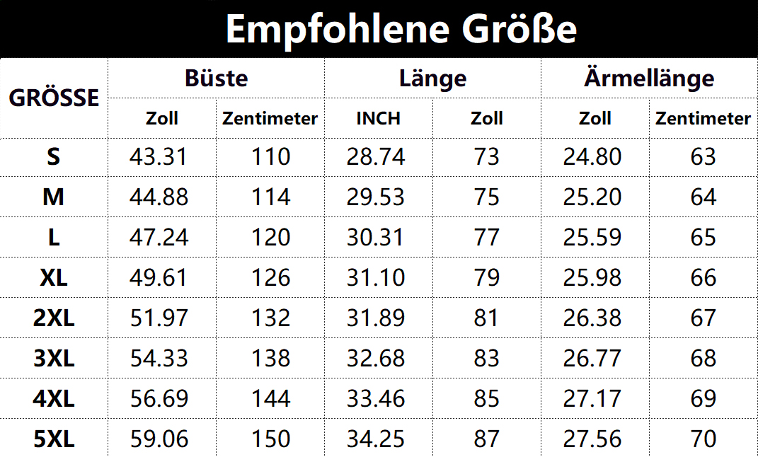 • Vorschlag: * Diese Daten wurden aus der manuellen Messung des Produkts erhalten. Sie können um 0,03-0,06 ZOLL/1-3 CM aus geschaltet sein.