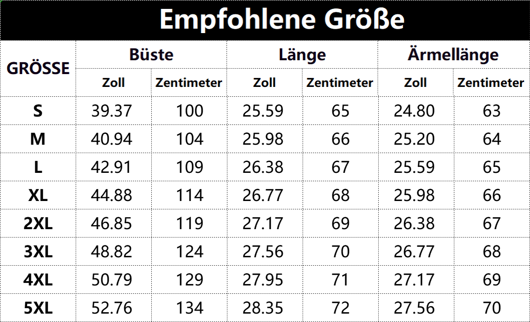 • Vorschlag:* Diese Daten wurden aus der manuellen Messung des Produkts erhalten, es kann um 0,03-0,06 ZOLL/1-3 CM aus geschaltet sein