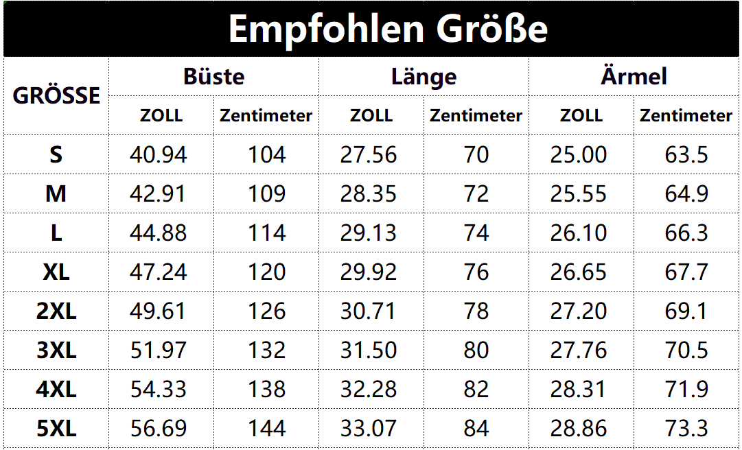 • Vorschlag:* Diese Daten wurden aus der manuellen Messung des Produkts erhalten, es kann um 0,03-0,06 ZOLL/1-3 CM aus geschaltet sein