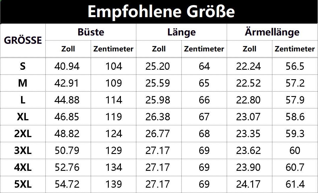 • Vorschlag:* Diese Daten wurden aus der manuellen Messung des Produkts erhalten, es kann um 0,03-0,06 ZOLL/1-3 CM aus geschaltet sein